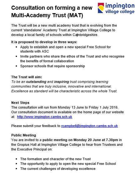 The Trust will be a new multi academy trust that is evolving from the current ‘standalone’ Academy Trust at Impington Village College to develop a local family of schools within Cambridgeshire. The new Trust will initially be formed by Impington Village College. Ten current Governors will become the ‘founder members’ of the new Multi-Academy Trust. It is proposed will develop in three ways:
