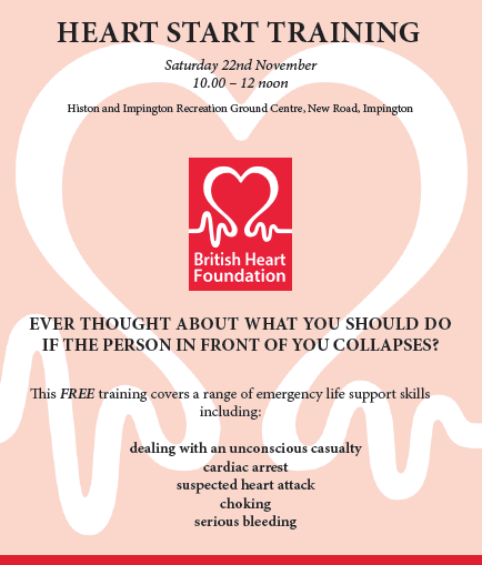 There is a FREE British Heart Foundation training session at the Recreation Centre on Saturday 22 November, from 10 a.m. to noon