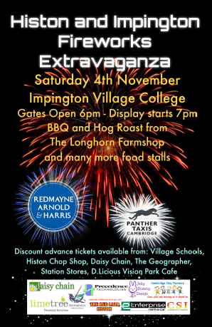 Histon & Impington Fireworks Extravaganza! by Clerk on October 31, 2017 Saturday 4th November Impington Village College Gates open 6pm – Display starts at 7pm
