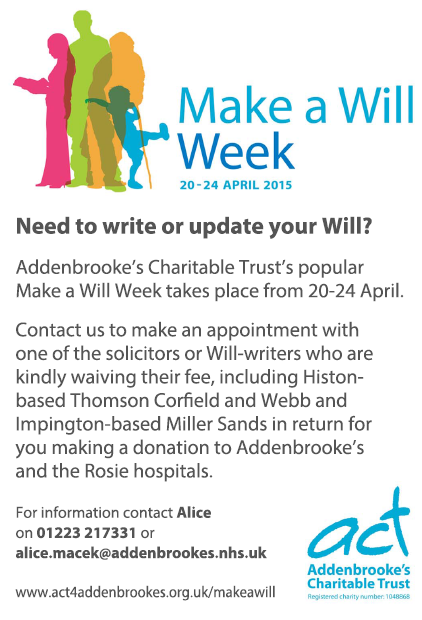 Addenbrooke’s Charitable Trust’s Make a Will Week will take place from 20-24 April, when a group of local solicitors and Will-writers, including Miller Sands in Impington and Thomson Webb and Corfield in Histon, have agreed to waive their usual fees and write or update a simple Will, in return for you making a donation to support patients at Addenbrooke’s and the Rosie.