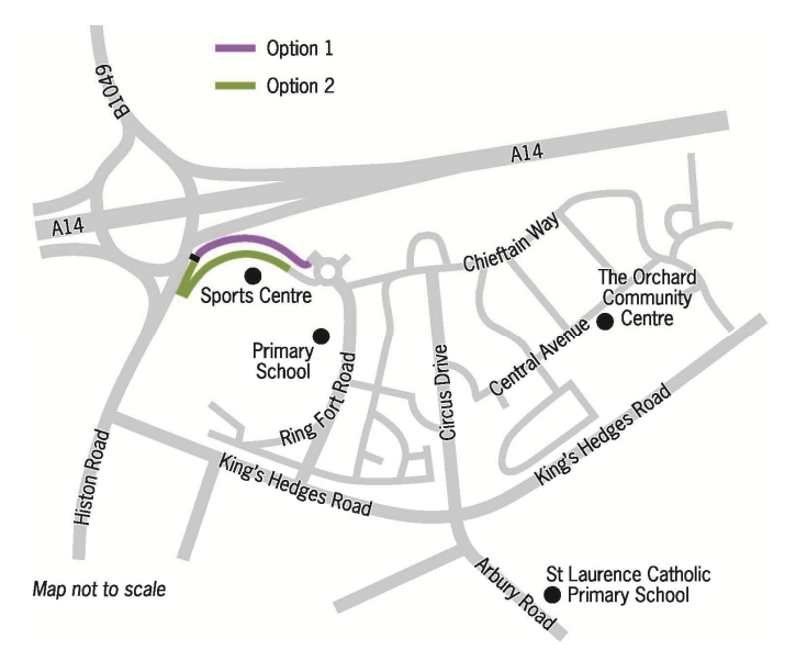 The County Council is looking at ways to provide a more direct access for pedestrians and cyclists from Orchard Park to Histon and Impington. Developers in the area have contributed £350,000 towards a new path. This would provide a link from the end of Ring Fort Road up the A14 interchange embankment to existing foot and cycleways along the B1049.